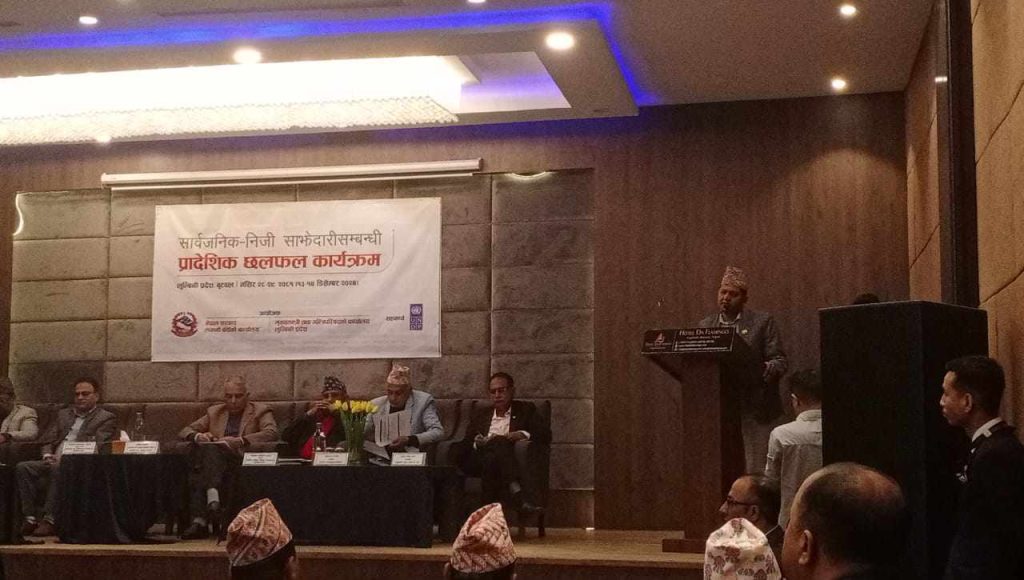 बुटवल, २८ मंसिर । लुम्बिनी प्रदेशका मुख्यमन्त्री चेतनारायण आचार्यले प्रदेशको विकास र समृद्धिको चाहना पुरा गर्न सार्वजनिक, निजी र साझेदारी मोडेलबाट लगानी जुटाउन सकिने बताउनु भएको छ । लगानी वोर्ड र प्रदेश सरकारको संयुक्त आयोजनामा बुटवलमा शुक्रबार गरिएको सार्वजनिक निजी साझेदारी सम्वन्धि प्रादेशिक छलफल कार्यक्रमलाई सम्वोधन गर्दै मुख्यमन्त्री आचार्यले समृद्ध लुम्बिनी, आत्मनिर्भर प्रदेशको संकल्प पुरा गर्न सार्वजनिक, निजी र साझेदारी मोडेलबाट लगानी जुटाउन सकिने बताउनु भएको हो ।‘सरकारको एक्लो प्रयासले मात्रै लगानी गर्ने अवस्था छैन् । यसमा सार्वजनिक, निजी क्षेत्र र साझेदारी मोडेलबाट लगानी जुटाउन सकिन्छ’उहाँले भन्नुभयो,‘सरकारले लगानीमैत्री वातावरण बनाउछ । लगानी जुटाउन लगानी वोर्डले भूमिका बढाउनुपर्छ ।’