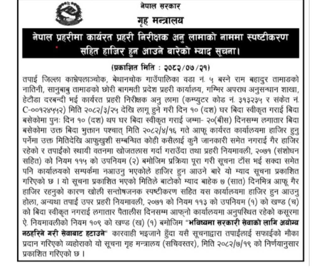 “प्रहरी निरीक्षक अनु लामा बिदा समाप्त भई कार्यस्थलमा उपस्थित नभएकाले यो सूचना प्रकाशित भएको मितिले सात (७) दिनभित्र सन्तोषजनक लिखित स्पष्टीकरणसहित उपस्थित हुन आदेश दिइएको छ।”